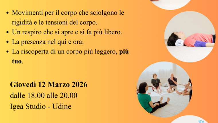 Per tutto il mese di ottobre all’IGEASTUDIO di Udine, in Via Monte Grappa 82a, ampio parcheggio gratuito, si terranno incontri di prova di Antiginnastica ogni giovedì sera dalle 19 alle 20,30, ad offerta libera e consapevole. Contatti: Nicoletta Martinelli cell 328 371 7617 email: sattelocin@libero.it